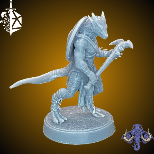 With sinewy limbs and slit-pupiled eyes, the Drakkling Scout moves with calculated precision through underbrush and shadow. Clutching a double-bladed adze and bearing a round shield strapped to its back, this cold-blooded operative is built for stealth and sudden violence. Its reptilian form is lean and alert—always scanning, always listening, always ready to strike or vanish.
